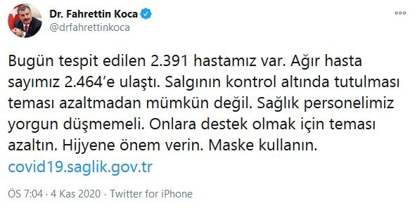 * Bugün tespit edilen 2.391 hastamız var. Ağır hasta sayımız 2.464'e ulaştı. Salgının kontrol altında tutulması teması azaltmadan mümkün değil. Sağlık personelimiz yorgun düşmemeli.