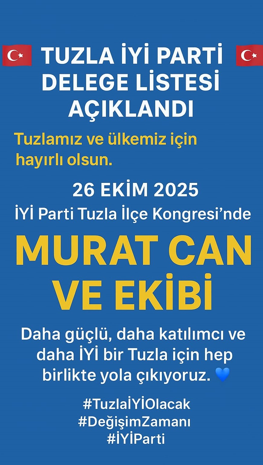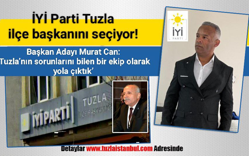 İYİ Parti Tuzla İlçe Teşkilatı 4’üncü olağan ilçe kongresini 26 Ekim 2025 Pazar günü Saat 11.00 ila 17.00 arasında Cami Mahallesi Sahil Sinema Salonunda gerçekleştirecek. İki adayın yarışacağı ilçe kongresinde mevcut ilçe başkanı Recep Karaot, beyaz listesiyle, diğer başkan adayı Murat Can ise Mavi Listesiyle partililerin karşısına çıkacak.